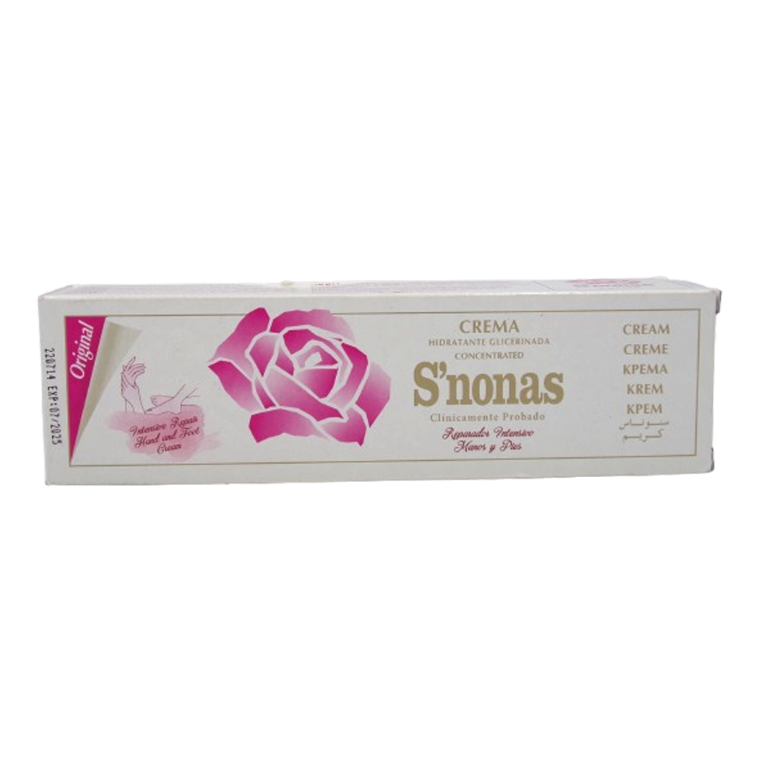S’NONAS moisturizing hand and foot cream is a rich glycerinated cream that nourishes, moisturizes and protects the skin from external aggressions, acting on all layers of the dermis.Its formula, made with 100% natural glycerin, maintains the necessary moisture levels and restores the hydrophilic balance, giving us soft, regenerated skin free of roughness.It has a very light texture, which gives it rapid absorption, without leaving a greasy or sticky effect.
